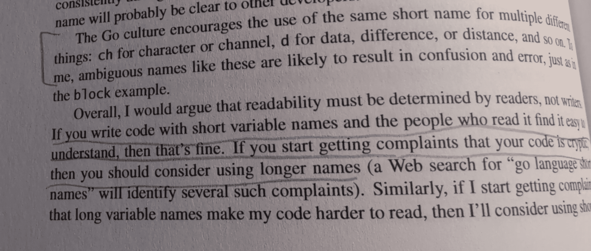 Yep, I find naming variables in Go maybe too short and unusual and quite hard especially when not familiar with what some letters stand for. I guess that with experience this gets easier to understand. I also don’t like loooooong names in JavaScript.
